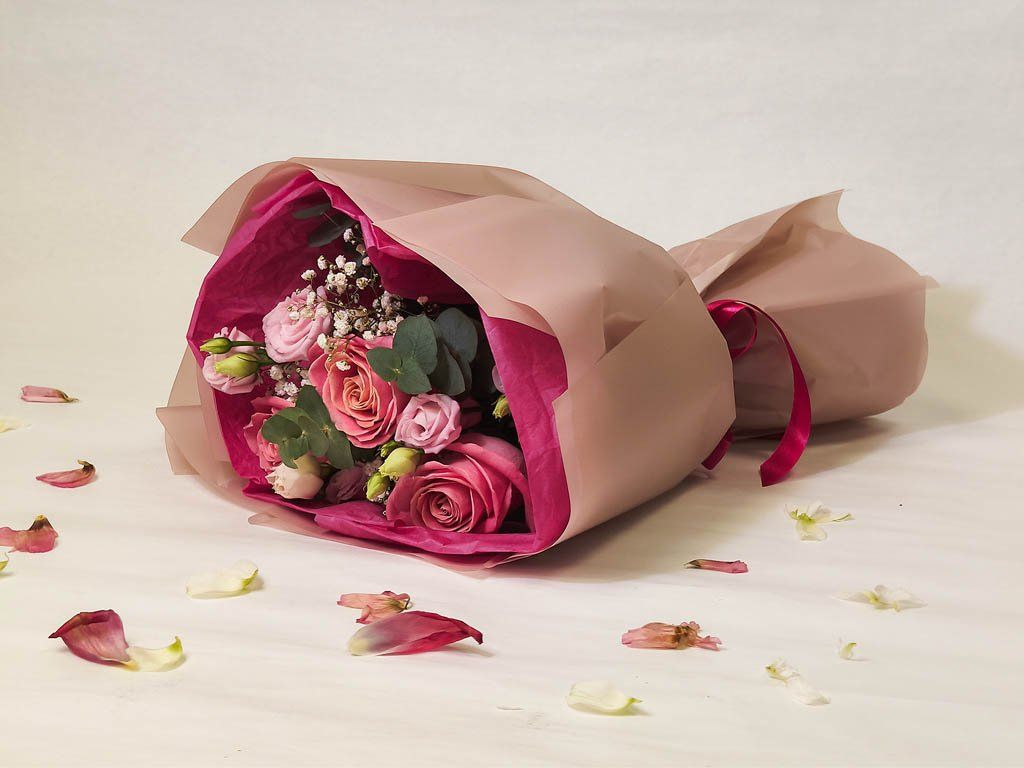 Kytica v nežných ružových tónoch je stvorená pre výnimočné momenty. Kombinácia ruží, lysiantusu, gypsomilky a eukalyptu vytvára harmonický a elegantný aranžmán, ktorý pôsobí jemne a zároveň luxusne.