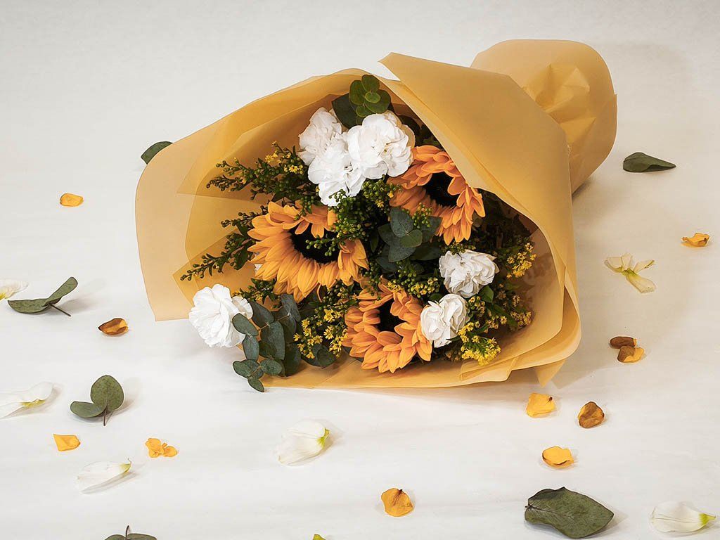 Kytica je plná energie a pozitívnej nálady. Dominantná slnečnica v kombinácii s klinčekmi a eukalyptom vytvára svieži a výrazný aranžmán, ktorý okamžite upúta pozornosť.