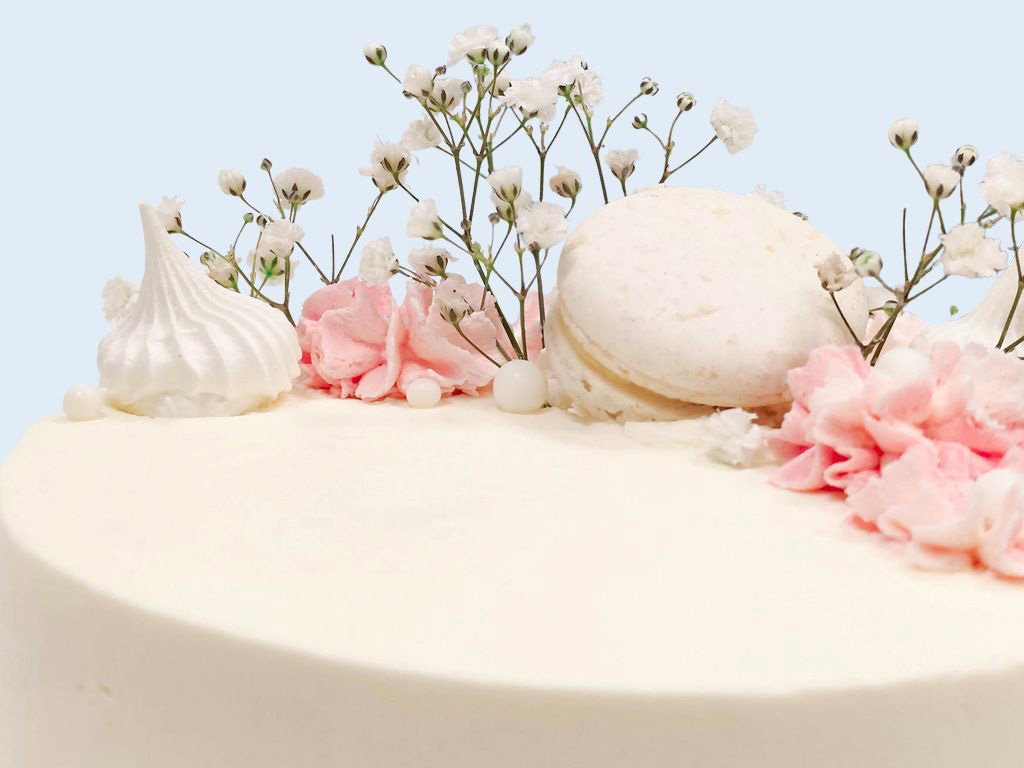 Zdobenie: biela makrónka, ružové krémové pusinky, snehové pusinky, gypsomilka, biele (alebo ružové) guličky